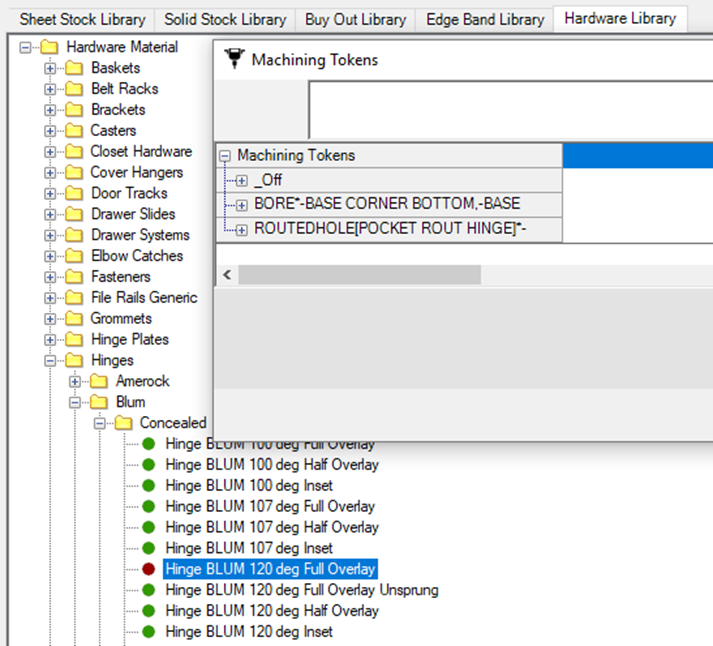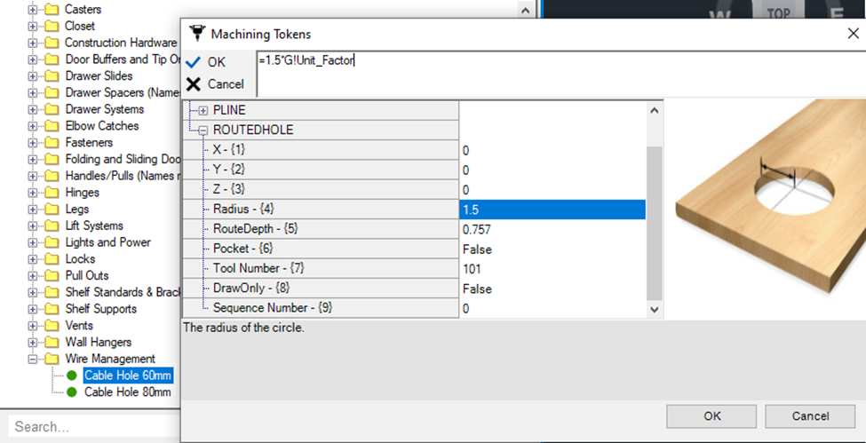 The great thing about being able to add “Machining Tokens” to a piece of hardware is that the machining needed for a given piece of hardware generally does not change. Once you have properly positioned your machining, you can apply hardware to any panel on any product on any job and the machining will always work the same. There is no need to ‘re-invent the wheel’ on every job. Simply set up a material file that contains the “Machining Tokens” you need, copy the material file to your template folder and you will be set. The machining for the Cable Hole was easy because it only requires machining of one part. We will discuss more complicated “Machining Tokens” later.