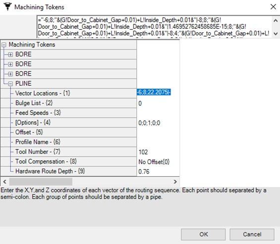 The X, Y, and Z origin of the token is zero, which means the machining will occur wherever you position the hardware. The other parameters of the token specify the diameter, depth, and tool number you will use to make the hole. Simple enough, right?