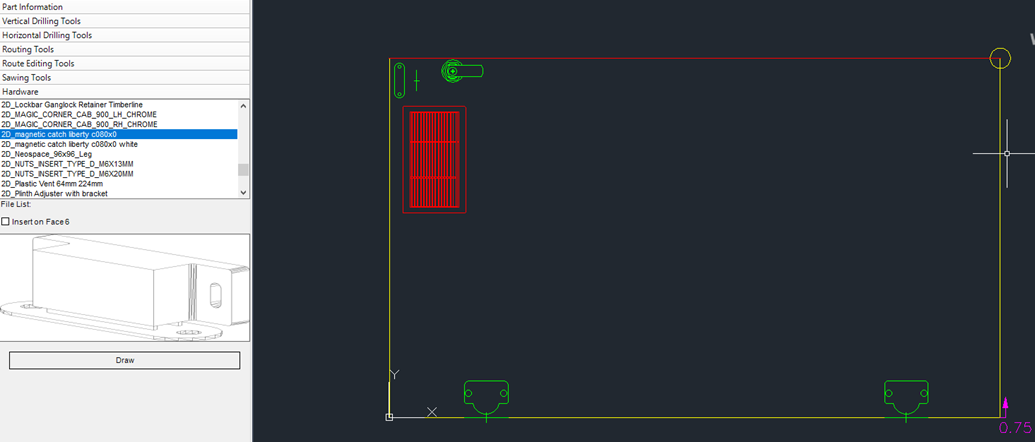 You have now added an associative elbow catch to the “2 Door Base cabinet”. Save and close the parts list and redraw the product. You should now see an elbow catch and the machining needed to attach the elbow catch.