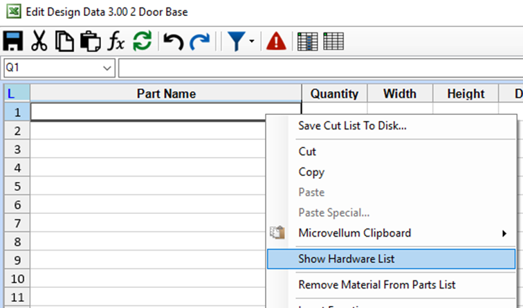 Now right-click in the first empty cell in the “Part Name” column and select “Show Hardware List”.