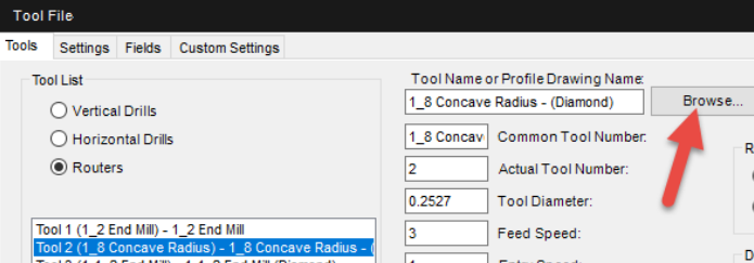 Select the Routers Tool List, Select the tool to update, and hit the Browse button. Find the new drawing you just created.