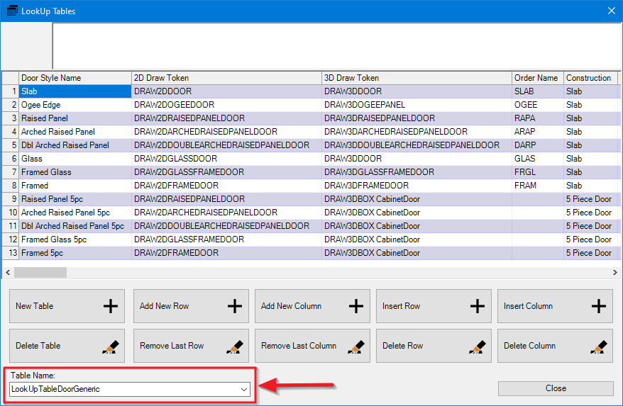Tables can be edited through the Door Style Interface or the Spreadsheet.