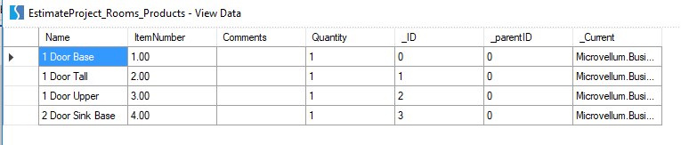 EstimateProject_Rooms_Products = product name, product item number, ID, and parent ID.