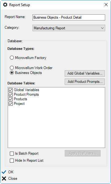 - Once you have configured the Business Objects in the Report Setup box, click the OK button. Re-open that report and click the button Edit Data Source again if you want to verify the data just entered. Again click Business Objects > Add Global Variables and Business Objects > Add Product Prompts to view the data that will be included in the report dataset. If it’s wrong, add or revise the data and click OK. Otherwise, click Cancel.