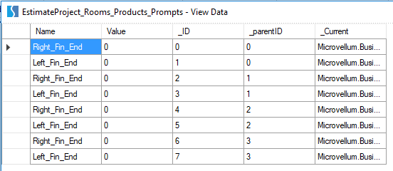 - Right-click the table named “EstimateProject_Products_Prompts” and click "View Data" to preview the individual prompt values included in the results of your Business Object product prompt configuration. You will notice that the field _ID in the Products table corresponds to the field _parentID in the Prompts table. Thus, in our sample, the two rows in the Prompts table with a _parentID of zero (0) belong to the row in the Products table with an _ID of zero (0).