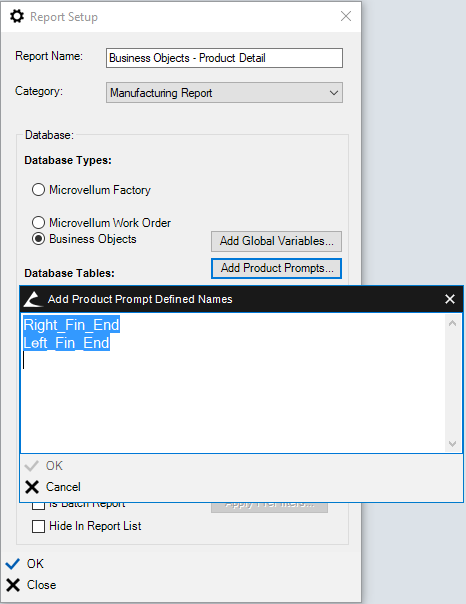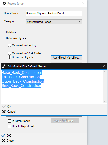 - When the Business Objects option button is selected, there are two additional buttons activated: Add Global Variables and Add Product Prompts. To use the Business Objects for data of either type, you must click the corresponding button and add the specific names to the list. The names must be the exact format of the defined name. For example, if the defined name for a prompt is "Right_Fin_End," you must not enter "Right Finished End." You must enter it exactly, "Right_Fin_End." The same is true for global values. For example, if the name of the variable is “Base Back Construction,” you must enter “Base_Back_Construction.” Do not try to click Add Global Variables or Add Product Prompts button a second time to view the data you have added until after clicking the OK button for the Report Setup box, as described below.