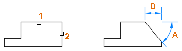 Sets the chamfer distance from the intersecting point of the selected objects and the XY angle from the first object or line segment.