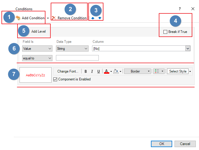 It is possible to set conditions for components so that when a condition is met, the style will be applied to that component. To modify conditions, proceed to the Conditions dialog in the properties panel of the style designer. Fig. 1 – Conditions ...