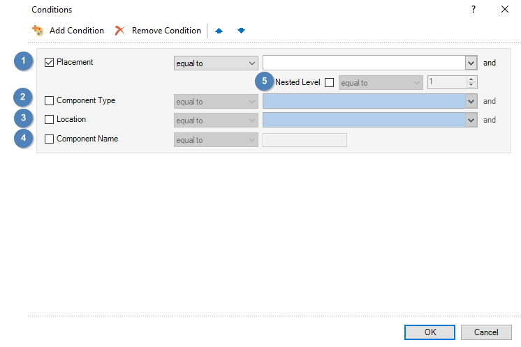 - Nested Level – With this condition, a style will be applied hinging on the nesting level of the containers that the components are placed in. The nesting level can be specified in the value field (maximum 100). The following conditions can be applied: