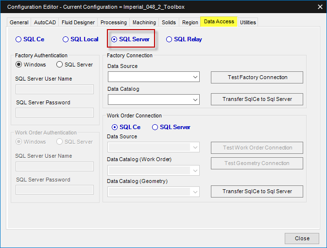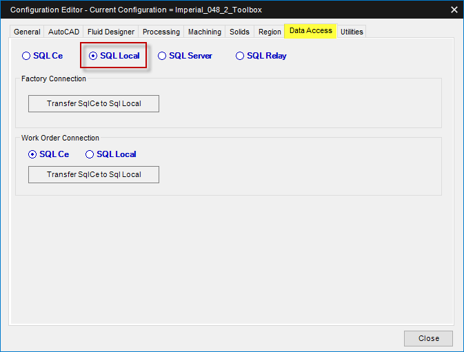 Used to convert Work Order SQL CE Databases into a single SQL Local Database. This step is necessary when transitioning to a single work order SQL Server database. Specify the type of database before clicking on the button Transfer SqlCe to Sql Local.