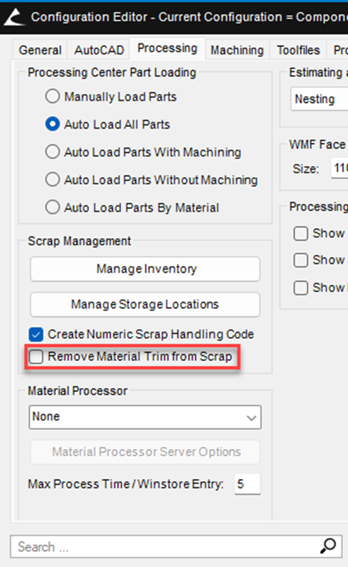 During optimization, the Microvellum Scrap Management System creates a 'scrap material' from what would usually be waste. It provides the ability to add scrap to available inventory for future nest optimizations. Check the Enable Automatic Scrap Management checkbox in the processing station to create and use scrap within the processing center. Enabling scrap management requires the minimum scrap length/width and minimum scrap area for scrap pieces to be set in the processing station.