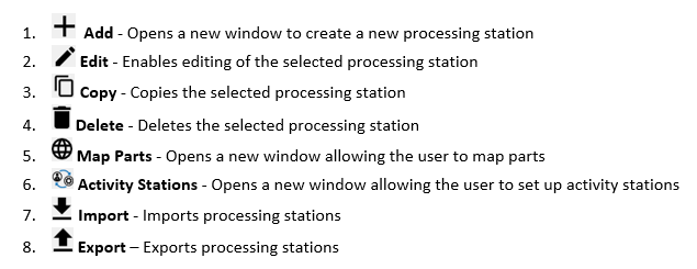 The Processing Stations tab allows you to create and set up processing stations (machining instructions). You can also export and import processing stations.