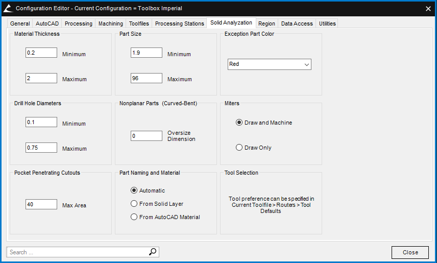 Solid Analyzation Settings To access the settings for solid analyzation, open the Toolbox Options (Toolbox Setup -> Options) and select the Solid Analyzation tab. Material Thickness – Allows you to specify minimum and maximum thicknesses for parts. ...
