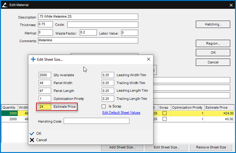 Fig. 2 - Edit Material and Enter Sheet Estimate Price