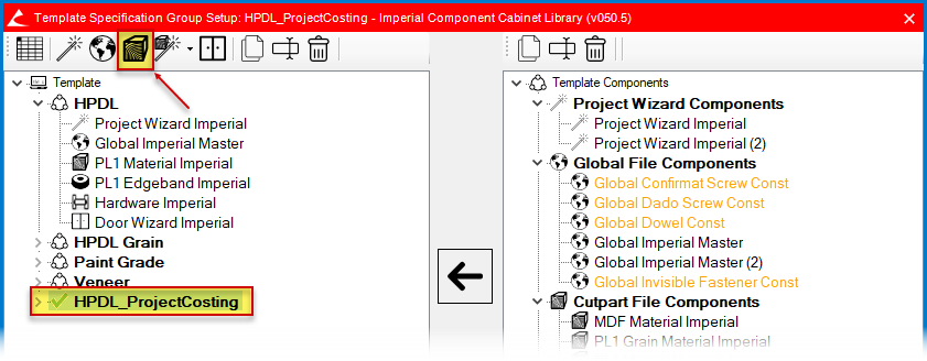 - Click the specification group you intend to modify or copy an existing group to create a new group. In Figure 1, I have created a copy named ‘HPDL_ProjectCosting’ and selected it. Make sure the intended group displays a green checkmark next to the name.
