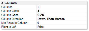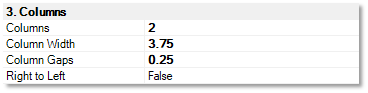 The Column Width property is used to determine the width of the columns. The width entered here is applied to all of the columns. The Column Gaps property specifies the width of the space between the columns.