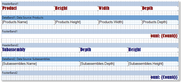 - Create a header and a footer for the Data Bands. When adding multiple lists, you will need to add multiple headers and footers. The Header Band should be placed directly over the Data Band it corresponds with, and the Footer Band should be placed under it.