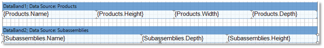 - Place two Data Bands on a page, and specify them with different Data Sources. In Figure 01, I’ve added Text Components and pointed them towards Data Columns.