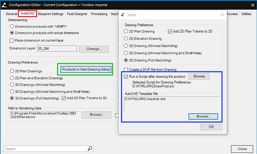 - Ensure that your products are drawn in 3D with full machining, then enable the “Run a Script after drawing the product” option, browsing to the location of the script file you placed. Then, change the AutoCAD Template File to the drawing template file you selected (in Figure 4, the Imperial template is shown). Hit OK, and the script and template will be applied to your next series of drawings.