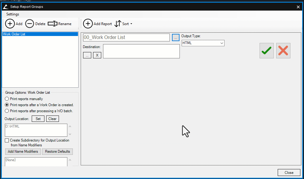 - Open the default report group "HTML", setting the Output Location to the Shared Network Path intended to be used. Then open the default report group "Work Order List" and do the same, ensuring there are no alternate destinations for any of the reports.