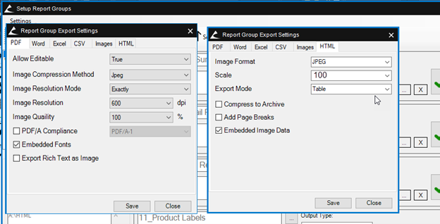 - Once both report groups are ready, set up your report group settings for HTML and PDF exports to match your preferences. Microvellum recommends the specifications in the image below.