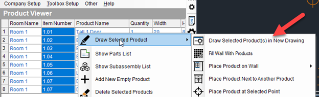 - Once the script and template are set up, open a project and a room, and begin drawing your products into individual drawings. Open the Product Viewer, highlight the list of all the products you want placed into your work order, then right click, hover over Draw Selected Product, and select Draw Selected Product(s) in New Drawing.