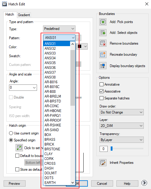 This parameter refers to the hatch pattern itself. For a full list of hatch patterns, type “HatchEdit” into the command line and select an internal. Within the Hatch Edit window is a dropdown list of patterns available.