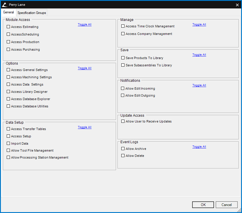 Fig. 2 - Use the Specification Groups tab of the Employee Permissions box to establish the types of operations each User is permitted