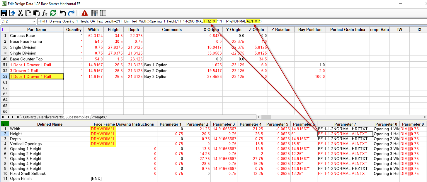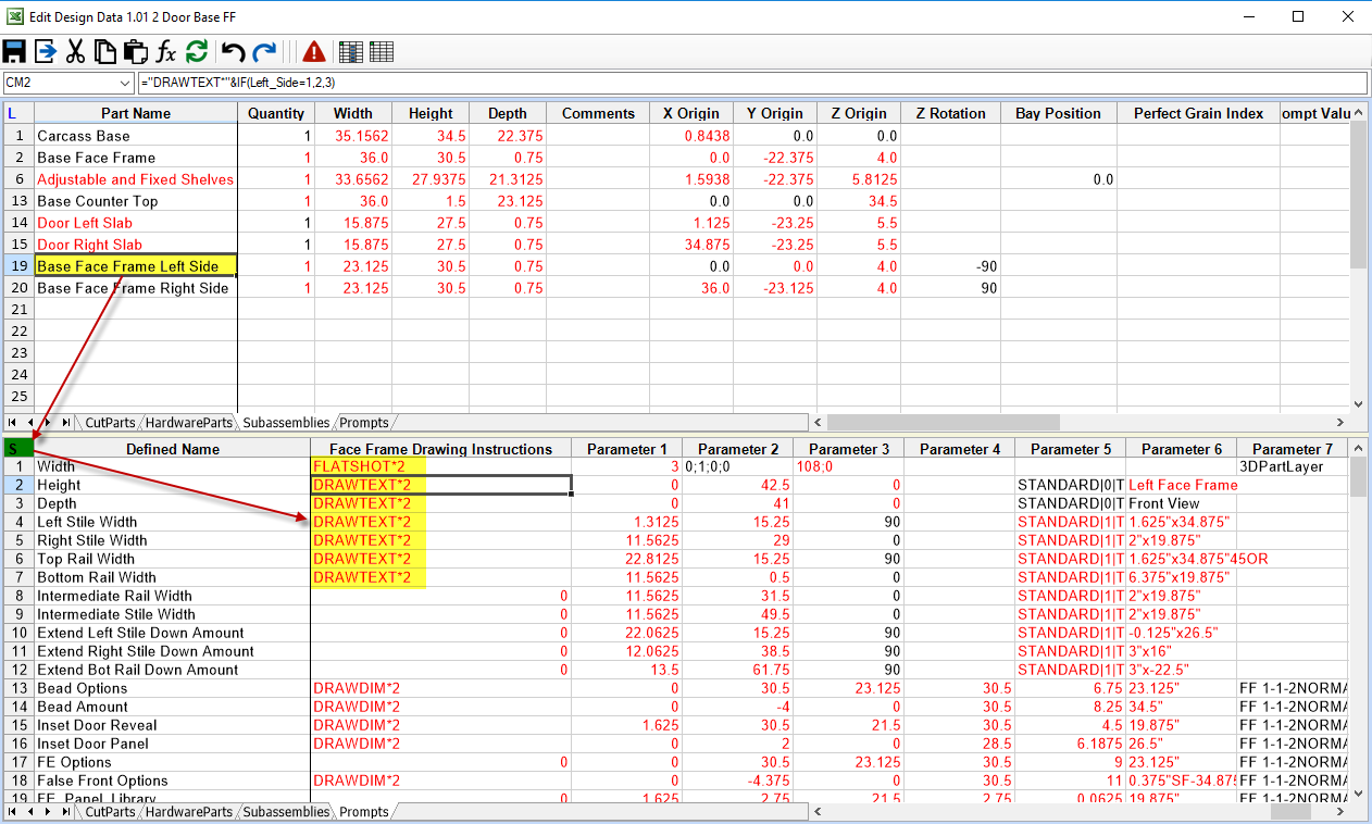 The drawtoken grouping ID is created with a formula that evaluates the Bay_Position defined name. If the value of that defined name is “101,” then a front view of a Rear face frame will be created instead of a front view of a front face frame. An example of this type of formula is included here: ="DRAWTEXT*"&IF(Bay_Position=101,4,1). It demonstrates what is possible to consolidate drawtokens using formulas.