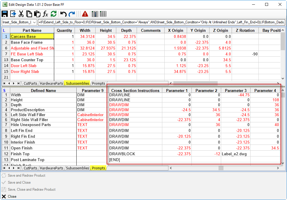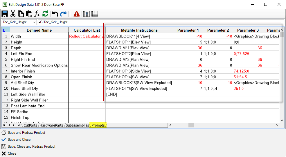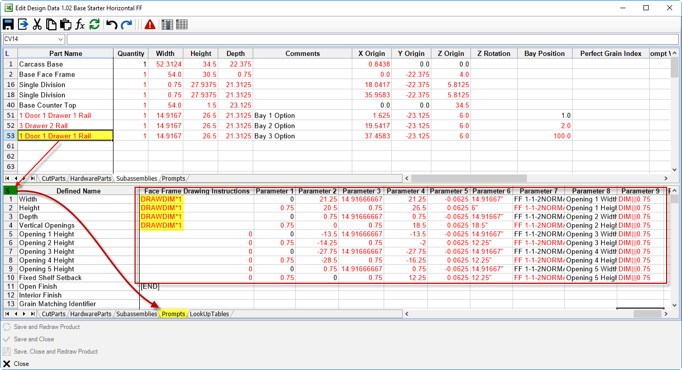 The automated face frame images in AutoCAD or the reports are produced with the use of draw tokens in the library data. These draw tokens are responsible for the automated creation of dynamic product images, plan view and elevation view drawings, cross-section drawings, etc. The tokens, along with their parameters, are located either in the product level prompts tab, or the subassembly level prompts tab of the workbook, as shown in Figures 1 and 2.