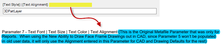 Parameter 7 – sets text properties in pre-15.5 builds. It has been retained for backward compatibility even though Parameter 5 now contains the options necessary to draw the image in AutoCAD and populate the database for reports.