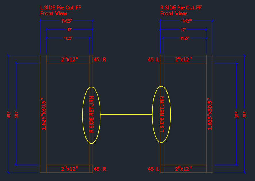 The flatshot drawing token does not display the right-angled face frame of pie cut corner cabinets opened up as a flat drawing. Instead, it displays it as two separate drawings with text located on the adjacent parts, indicating a return on the appropriate side.