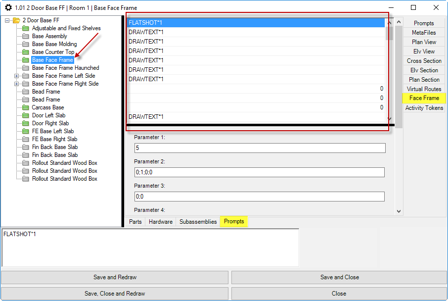These draw tokens also produce the face frame images, but are not present either in the main L workbook (prompts page) or in the Carcass Base subassembly prompts page. They exist only inside the face frame subassembly prompts page.