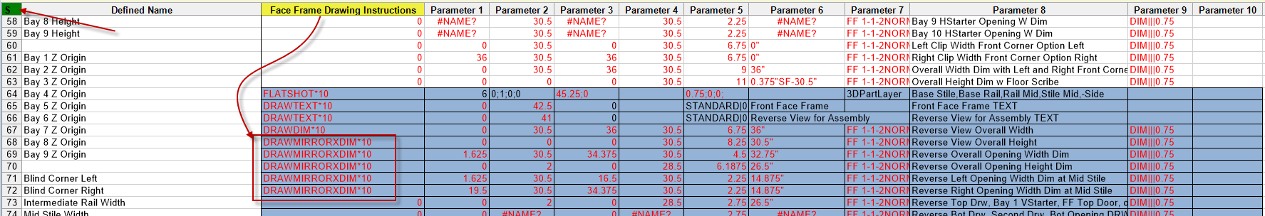 There is now a new draw token that mirrors the DRAWDIM tokens on the X-axis. The new token is named DRAWMIRRORXDIM and is contained in the Face Frame Drawing Instructions column of the subassembly prompts tab of the spreadsheet.