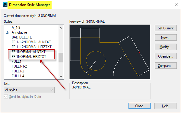A new dimension style has been added to adjust for the size of the cabinet. There is a new 1" style, in addition to the 1-1/2" style. They are named "FF 1NORMAL ALNTXT" and "FF 1NORMAL HTRZTXT" and are accessible using the AutoCAD DIMSTYLE command.