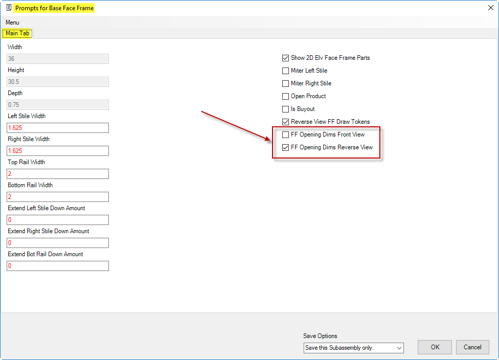 The subassembly prompts also make it possible to change the way you display the dimensions on a local level, for individual products without affecting all other products. Display the subassembly prompts for the face frame subassembly to access these prompts.