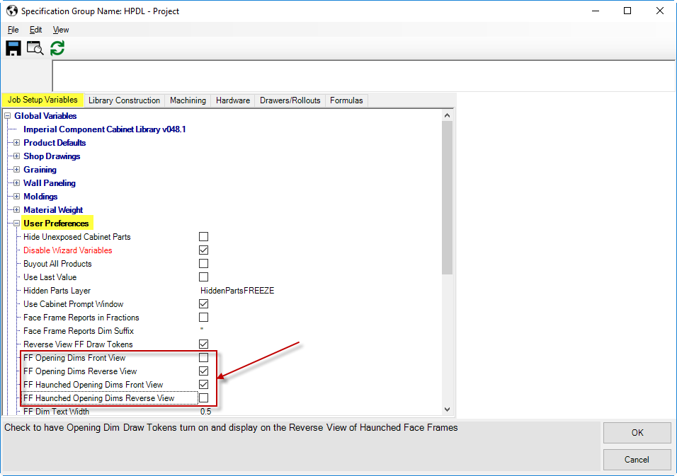 Several global variables make it possible to set the right combination of opening dimensions for each User. You can display the dimensions on the front, or the reverse view, or both. Likewise, the front or reverse view for the haunched face frame, or both. By default, the globals are set up to display opening dimensions on the reverse view of regular face frames, and the front view of haunched face frames.