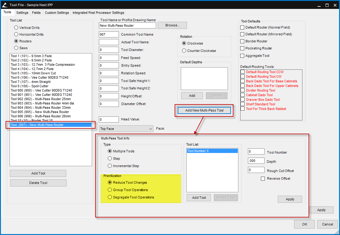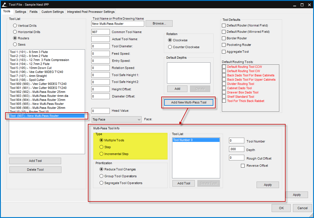 Multi-Pass Tools Multi-pass tools can be added to the list of available routing tools. Multi-pass tools are often used when working with specific materials (i.e., thick materials or lumber materials). Multi-pass tools must be listed with a common ...