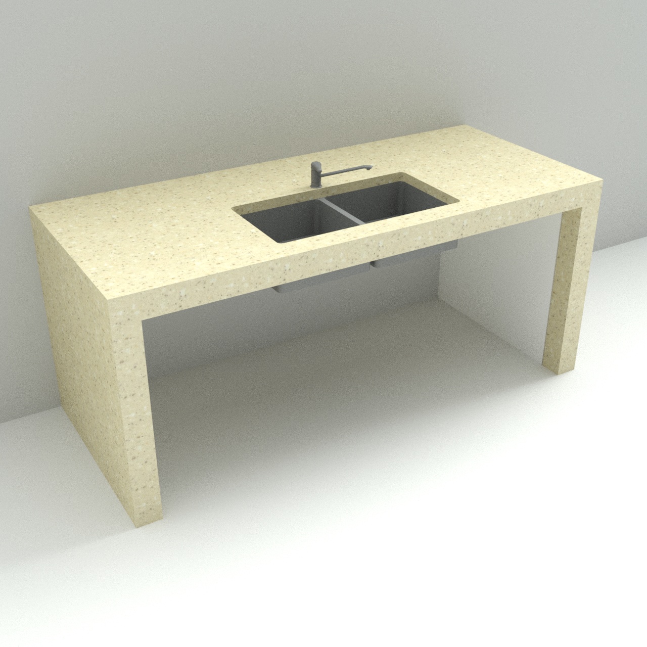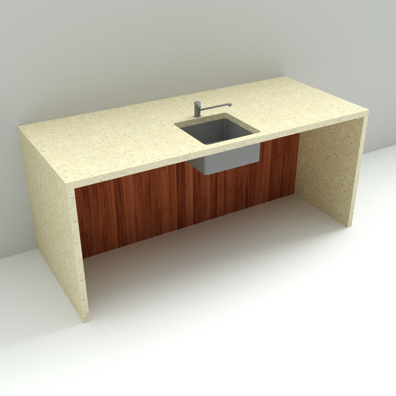A countertop product with a built-in substrate and appliance options, allowing clients to select between a sink, stove, and cooktop. The product can optionally add waterfall ends and is designed to be placed against wall components and on top of other solids. This product uses standard prompts, as well as prompts specific to countertop products, and to customize the location of its built-in appliance.