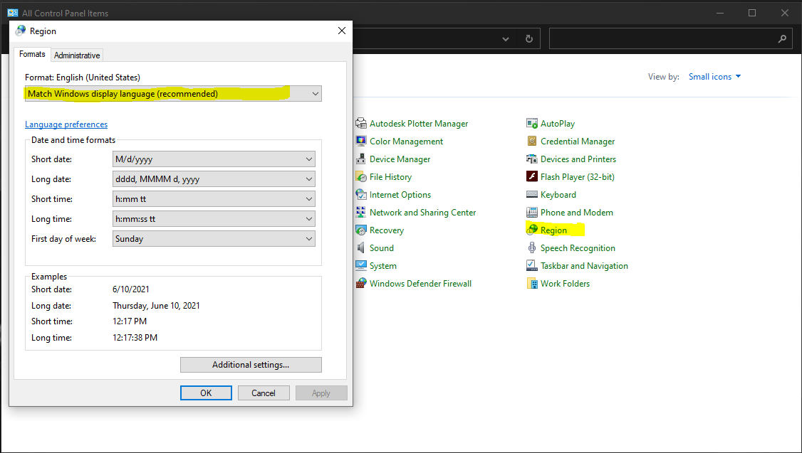 In the control panel, select "Region" and change the "Format" to English (United States), see photo below. Dans le panneau de configuration, sélectionner "Région" et changer le "Format" pour Anglais (États-Unis), voir photo ci-bas.