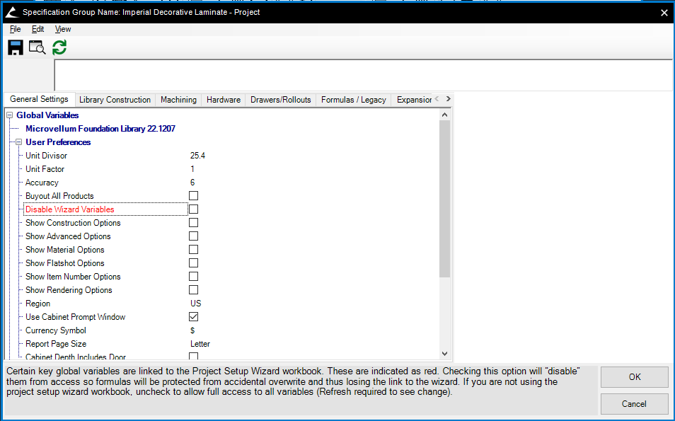 The Project Wizard is composed of variables that typically fluctuate and are often changed from project to project. The Global Variables points to values of the Project Wizard to get its instructions. In the Global, if a variable has red text, this indicates that it is a Wizard Variable. You will not have access to alter these variables in the Global, as changing the value will break the link to the Wizard. However, the value of these variables can be overwritten under User Preferences in the Global if you do not plan on using the Project Wizard.