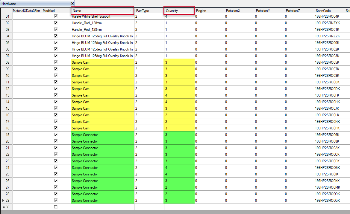 Microvellum calculates the total quantity of the individual cam connectors and cam screws based on how many times that machining for the connector and the screw pair occurs in the work order. It is also done similarly with the hardware specified in the other three tokens supported.