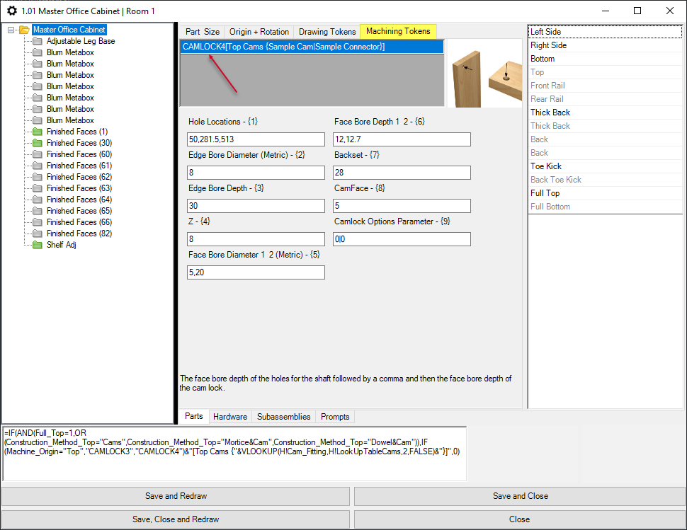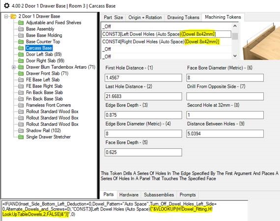 Using this new feature of Microvellum, configure the machine tokens HOLES, PLINEFROMHOLES, SLIDE, and CAMLOCK machine tokens to populate the work order database with specific hardware names. These names may be modified in either the Part Properties interface or the Edit Design Data (aka Library Spreadsheet) environment.