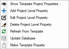 The User Defined Project Properties, by default, contains fields that are used for estimating reports. These fields can be edited, deleted, or new fields can be added. These fields can be set up to populate fields in title block attributes. User-defined properties can be set up to look to specific variables (Project Properties, Global Variables, Project Wizards). You can set these up by using Edit Project Level Property. Once fields have been set up to reference a variable, you can use the Update Database function to have those fields automatically populated. To access these options right-click on a field.