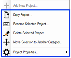 To edit the Projects Tree, select a category and right-click. This will display the Projects menu. When a category has been selected, the following options will be available: