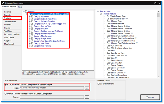 When exporting Products, all records associated with the selected Product(s) are NOT transferred by default. Records such as Subassemblies and Materials should be selected independently.