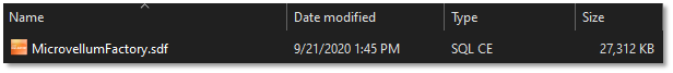 A MicrovellumFactory.sdf database file is created containing the reports exported and various other tables of data.