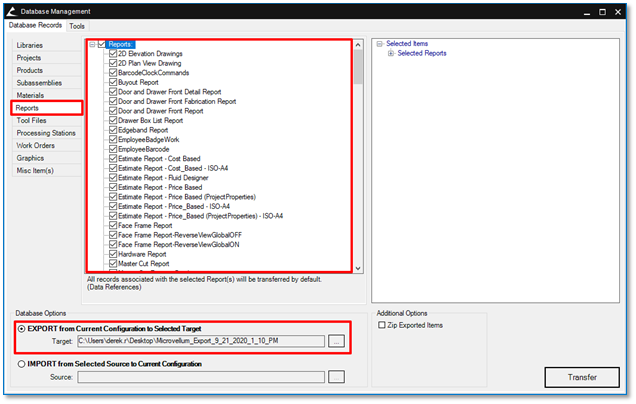 All records associated with the selected Report(s) (Data References) are transferred by default.