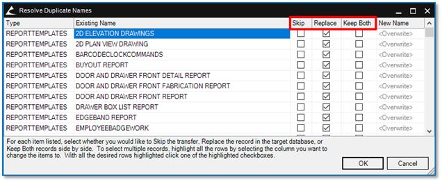 When the file being exported to is empty, or lacking a MicrovellumFactory.sdf database, a database is automatically created with the exported data inside. When the file being exported to already has a MicrovellumFactory.sdf database, and this database features duplicate information, the Resolve Duplicate Names window appears. When there is no duplicate information, the data being exported is appended to the database.