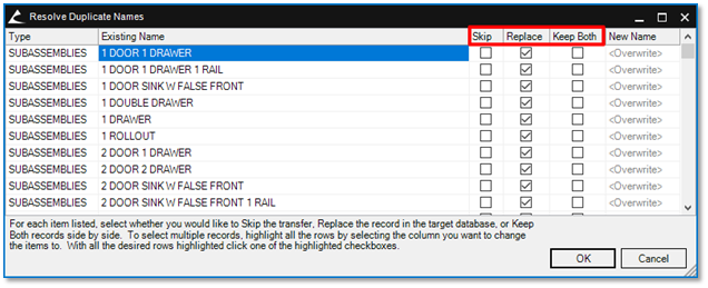 When the file being exported to is empty, or lacking a MicrovellumFactory.sdf database, a database is automatically created with the exported data inside. When the file being exported to already has a MicrovellumFactory.sdf database, and this database features duplicate information, the Resolve Duplicate Names window appears. When there is no duplicate information, the data being exported is appended to the database.